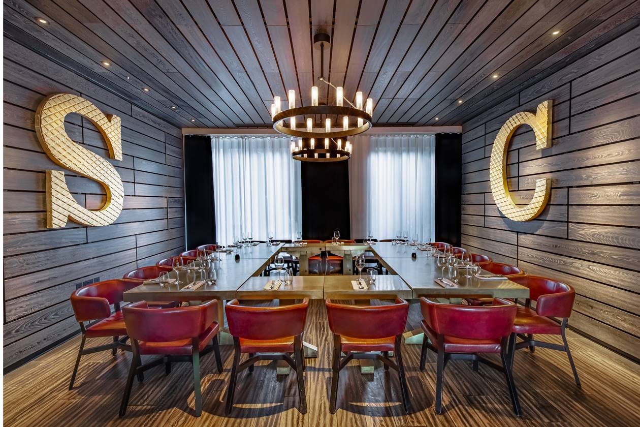 Located within Sea Containers Restaurant and with its own secluded south-facing terrace, the private dining room provides an intimate setting for up to 22 guests. Featuring bespoke gold dining tables, comfortable leather seating and custom-designed atmospheric lighting designed by Tom Dixon and Jacu Strauss.