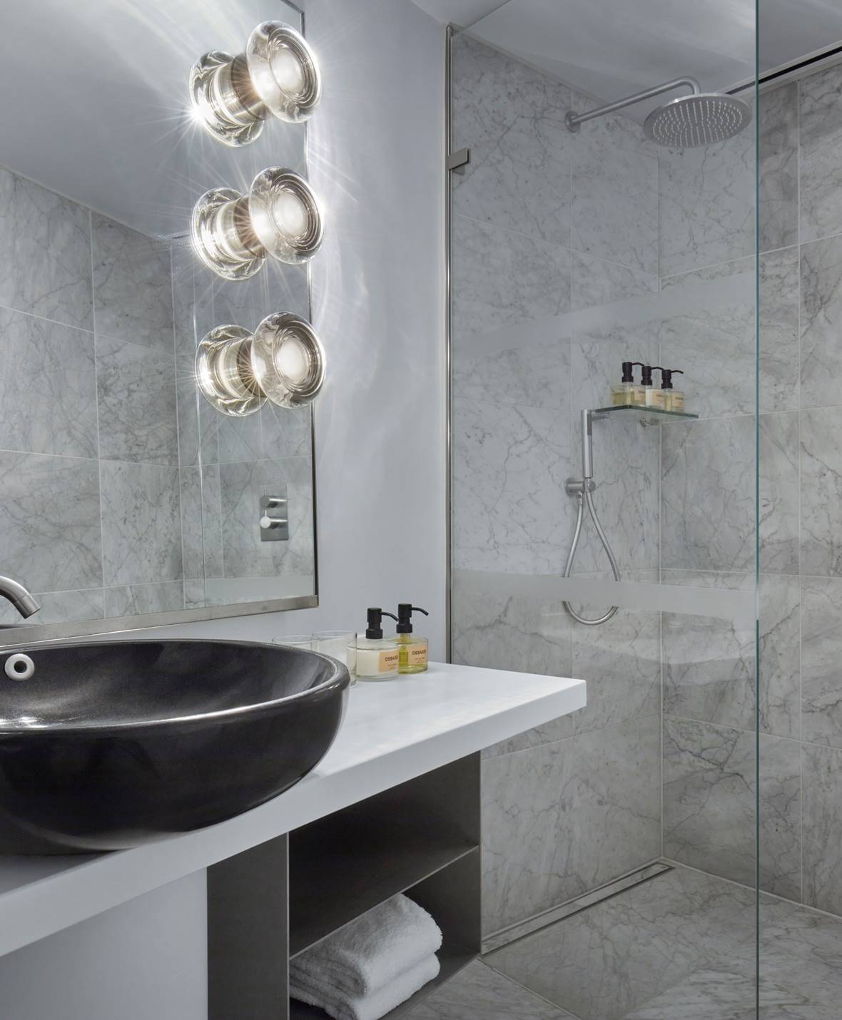 Carrara marble bathroom with rainfall shower or bath