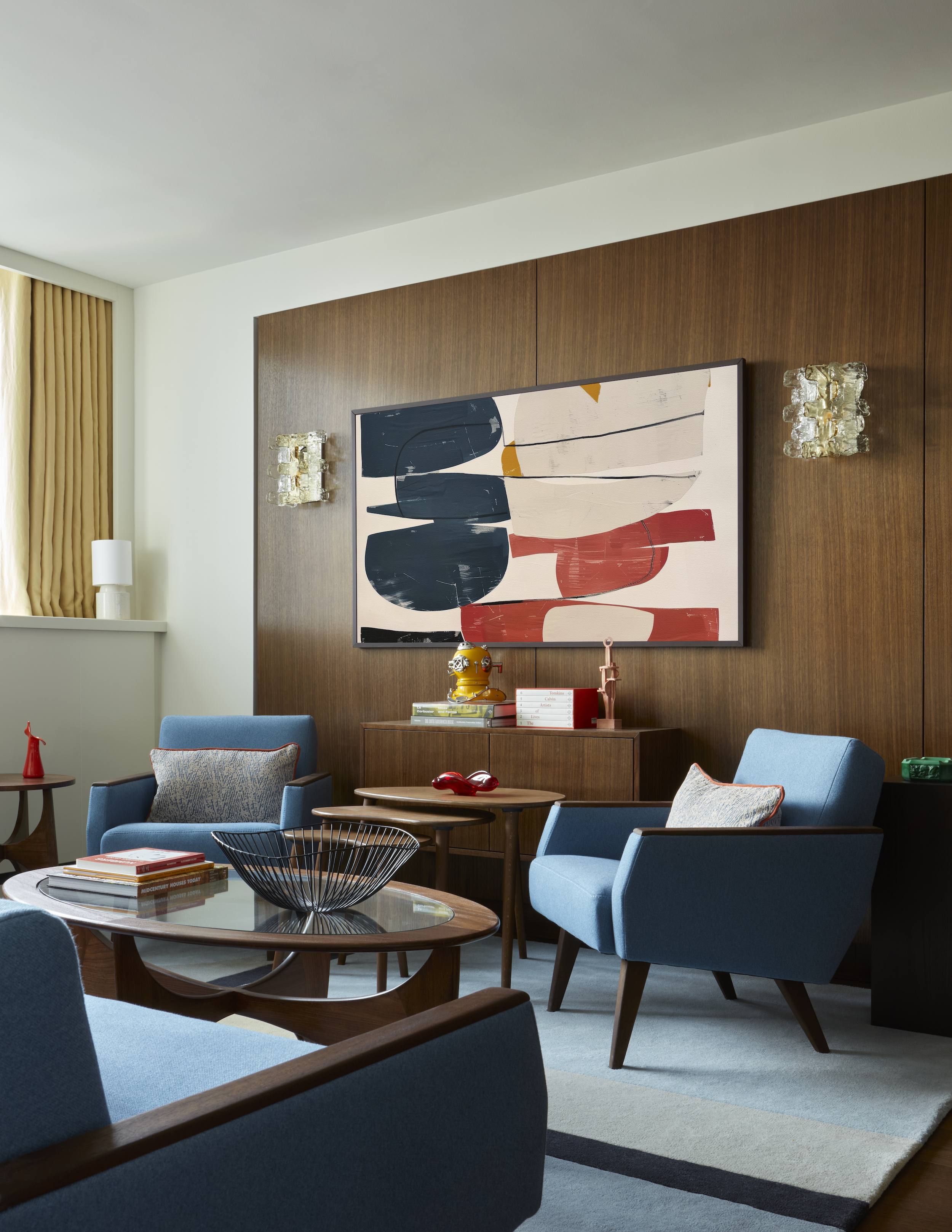 A Danish powder-blue sofa and chairs set centre stage, capturing the era’s love for colour, comfort and clean lines and creating an inviting space to enjoy the views.