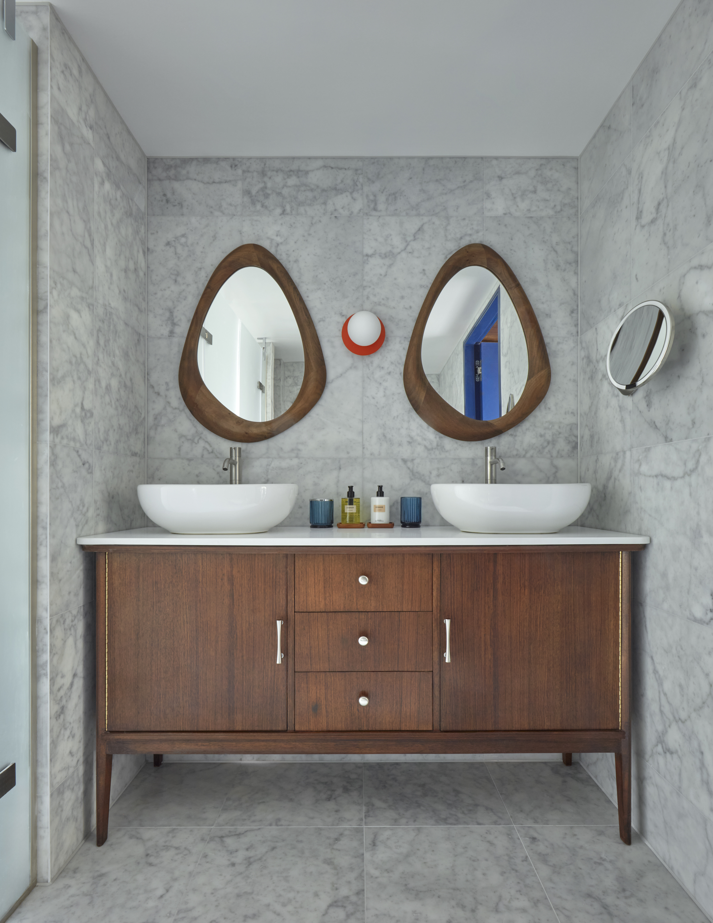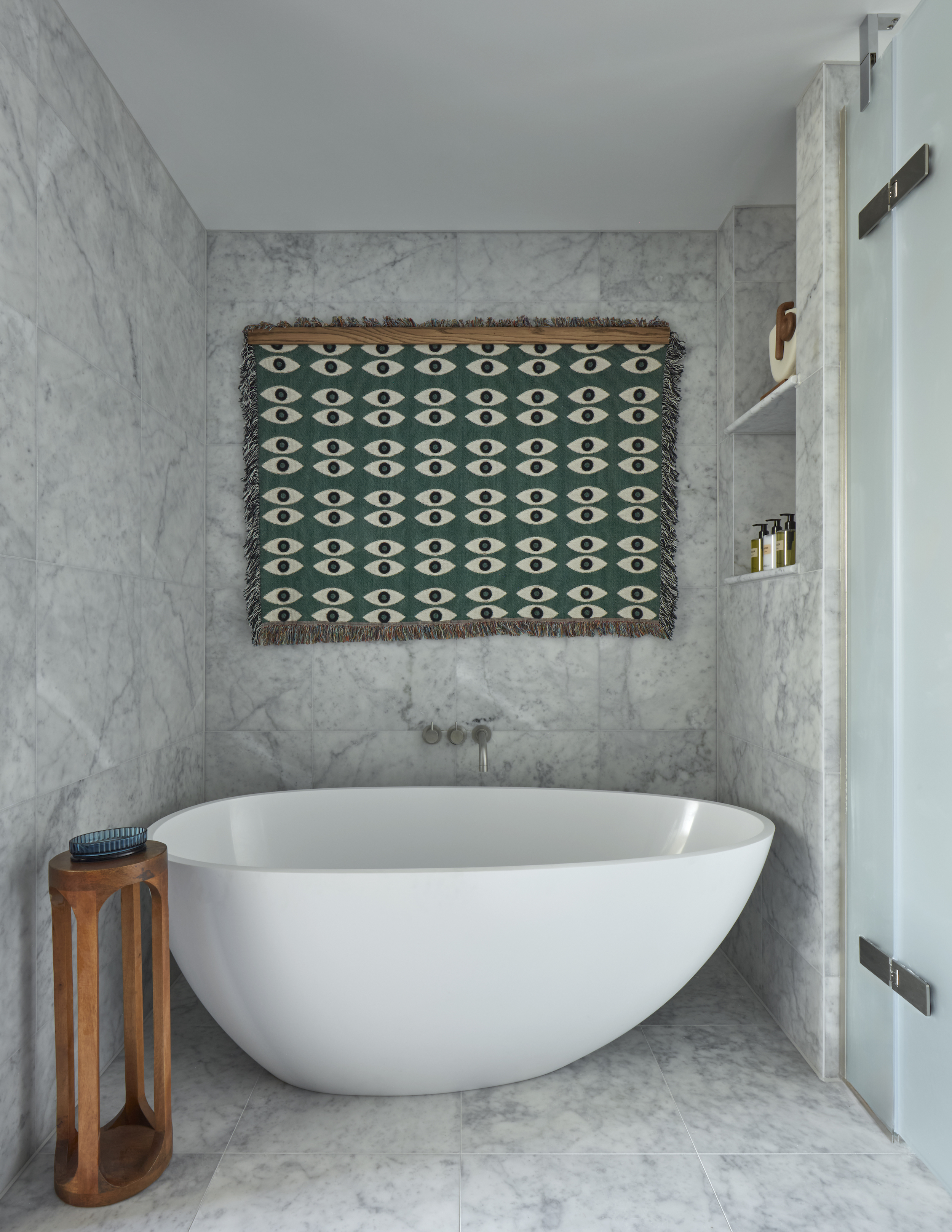 Step into a marble-clad en-suite that marries Mid-Century style with modern luxury. Soak in a freestanding bath or refresh under the rainfall shower.
