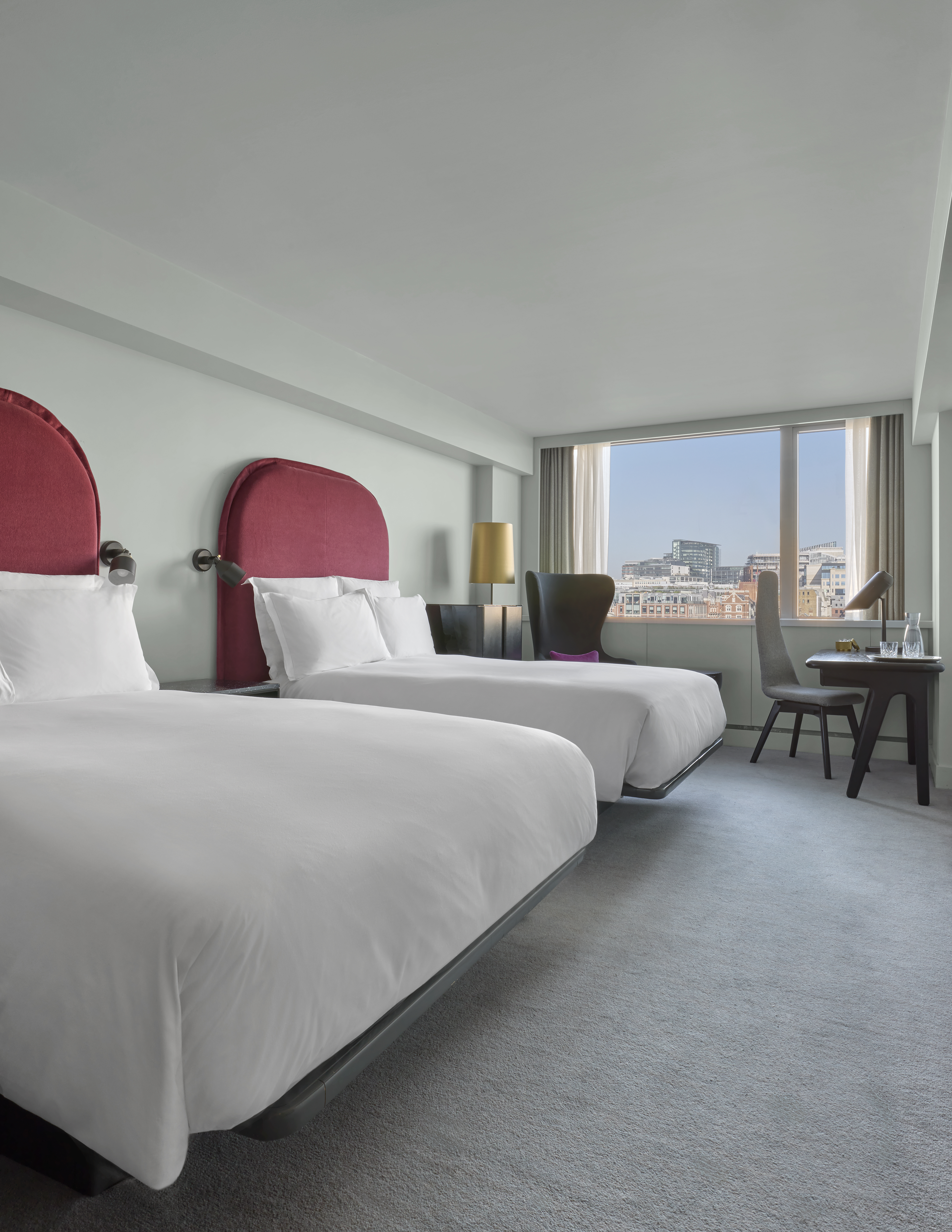 Our Riverview Deluxe Double Double hotel rooms feature twin double beds positioned overlooking the Thames, with unparalleled views of London from the wall-to-wall windows.