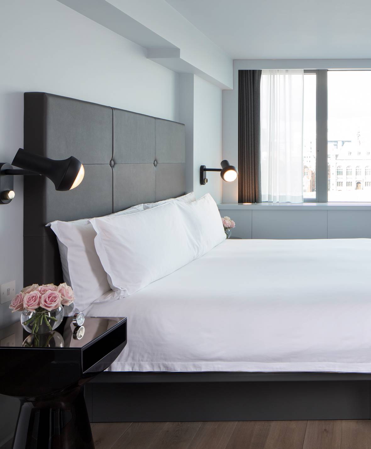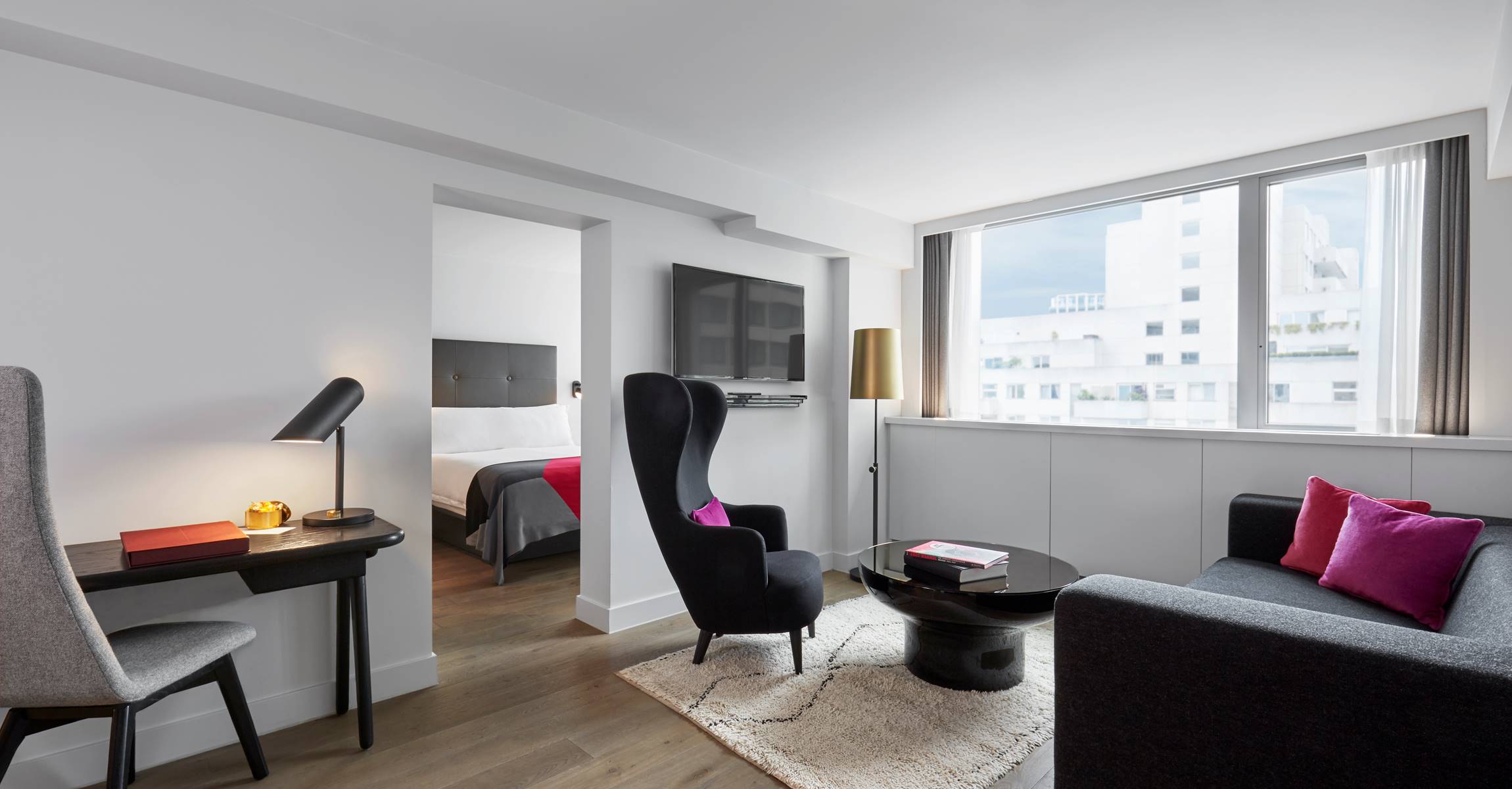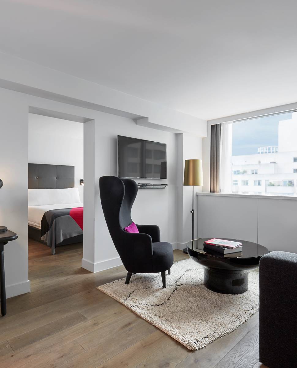 Our One Bedroom Suites offer a spacious en-suite bedroom which opens into a separate living area, featuring bespoke designed furnishings. Guests can relax in a signature wingback chair or comfortable sofa, or focus on work at the desk.