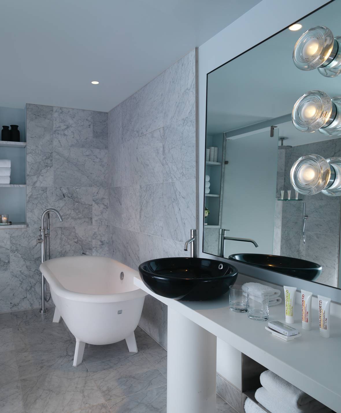 The One Bedroom Suites feature marble en-suite bathrooms complete with rainfall showers and a freestanding bath. An additional powder room leading from the living room maintains discretion when entertaining guests.