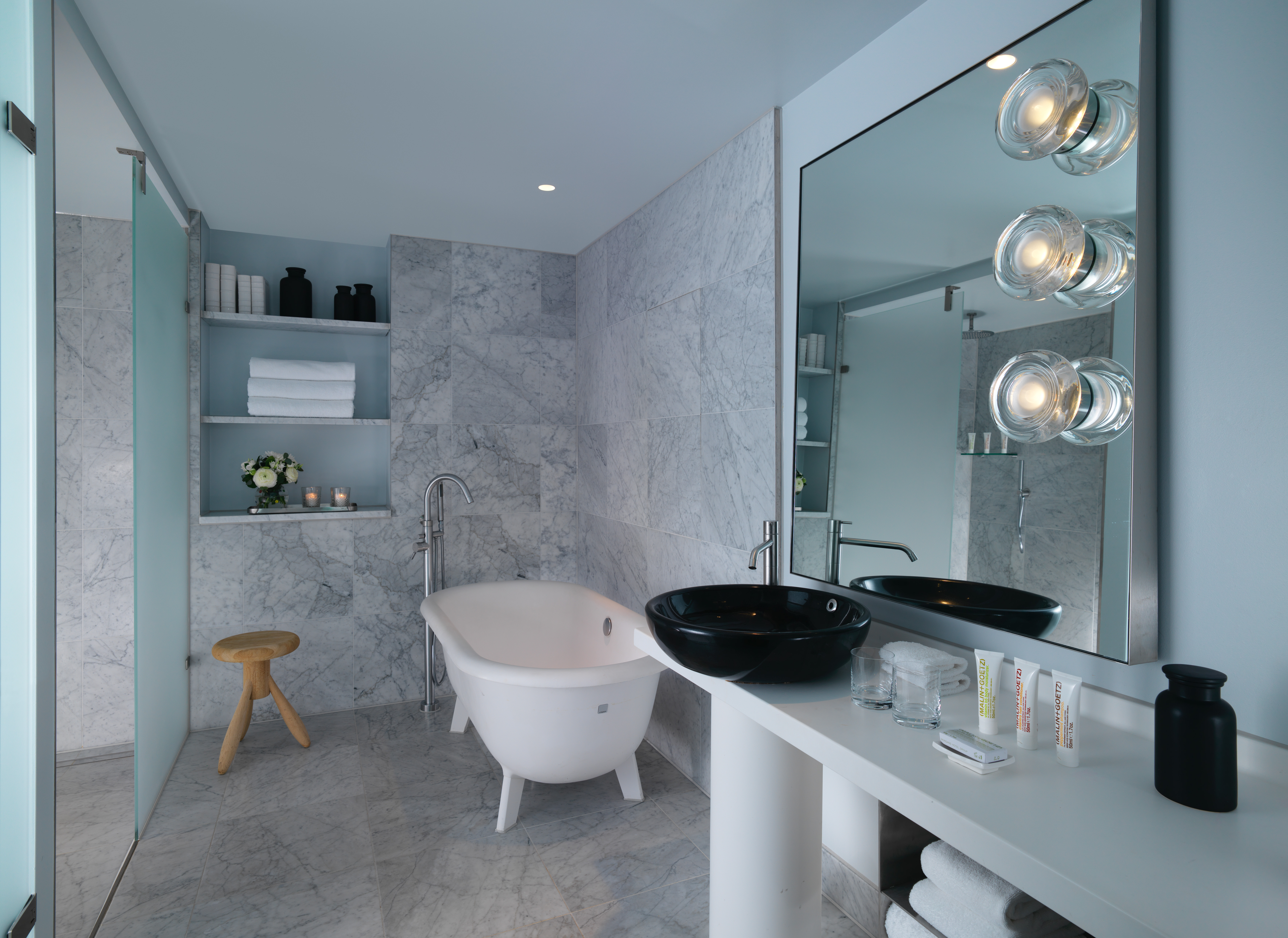 The One Bedroom Suites feature marble en-suite bathrooms complete with rainfall showers and a freestanding bath. An additional powder room leading from the living room maintains discretion when entertaining guests.